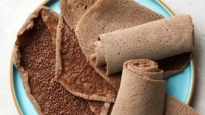Injera is an Ethiopian flatbread made with teff flour rather than wheat flour. Teff has an almost oaky flavor with deep organic notes, which makes this flatbread a flavorful addition to an array of spicy Ethiopian food. It is cooked on a skillet, and because the batter is relatively thin, it will form a crepe-like texture. Like other types of flatbread, injera is used as a utensil; its soft, porous texture allows it to easily soak up sauces, stews, and curries.