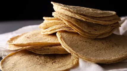 Tortillas were first believed to be the result of the Mayan civilization living in modern-day Mexico. According to Alto Hartley, one common origin story is that a Mayan peasant offered a corn-based flatbread to a Mayan king. The word "tortilla" is derived from the Spanish word for "little cake" and can be made with corn (maize) or wheat flour. The tortilla's thin shape results from pressing with a metal contraption. After the dough is thinned, it is cooked quickly on both sides in a pan before being served with a myriad of Mexican foods like refried beans or as a vehicle for the beloved taco.