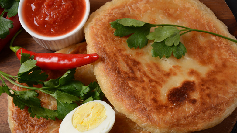 Malawach is a Middle Eastern flatbread made as a stand-alone dish or a vessel for scooping hot curries and sauces. The flavor of this bread is delicate and super-rich due to the copious amount of butter used to develop a buttery, layered structure. There are no eggs used to make this flatbread. According to Reboot, malawach was brought to Israel by Yemenite Jews in the 1950s. The bread is usually served with a drizzle of honey or as a savory accompaniment to hard-boiled eggs, tomatoes, and zhug (or schug, a green hot sauce with parsley and cilantro).