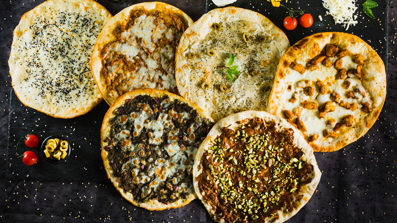 Manakeesh is a popular flatbread in the Levantine region of the Middle East. The root of the singular version of manakeesh (mankosheh) translates to "that which is decorated with colors, writing or that which is engraved" (via Chef in Disguise). In the Levant, manakeesh is decorated with one or two toppings, including za'atar, labneh, or eggs. Chef in Disguise notes that manakeesh is often eaten as a breakfast food in Jordan, Syria, and nearby countries and has been modernized to include toppings like Nutella, banana, cheese, and meat.