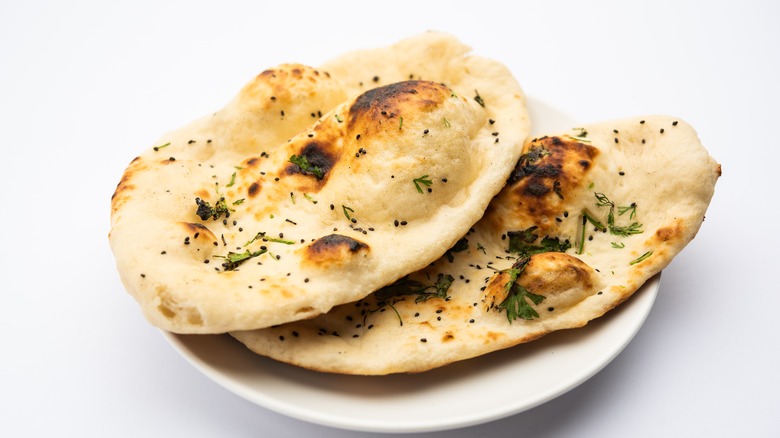 Naan is typically eaten alongside curries to soak up juice, spice, and flavor. It can be seasoned with fresh herbs like cilantro and coated in a layer of ghee (clarified butter).
