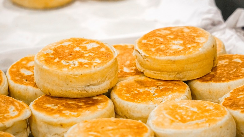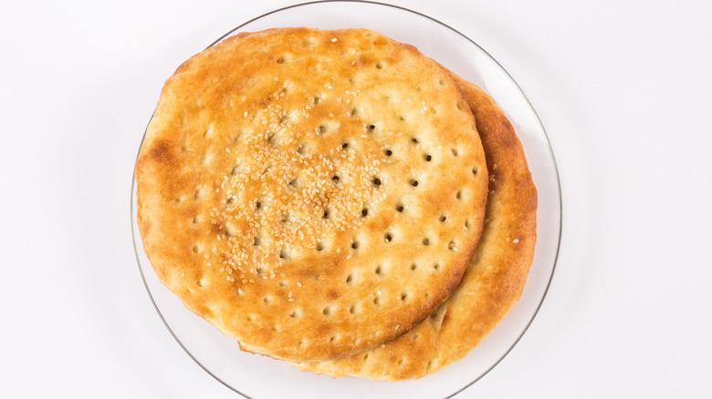 Shaobing is a baked, unleavened flatbread found in Northern China. These small, layered, and disc-shaped flatbreads are usually topped with sesame seeds and eaten for breakfast (via Wise Geek). Shaobing is often sold by street vendors in China and can be made with layers of sweet or savory filling. Red bean paste, mung beans, tofu, and egg are common savory fillings, while the more plain, unfilled rolls are served alongside eggs and breakfast meats. In the north, diners will pair shaobing with soup or as a side, while the southerners tend to stick to the sweet breakfast shaobing and soy milk.