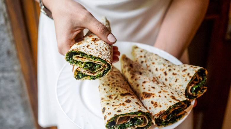 Like pita, lavash is a flatbread that originated around the Middle East. This leavened or unleavened bread was originally baked in a subterranean clay oven called a tonir (via Organic Flatbread) but has since been modernized to cook in an oven or on a griddle.