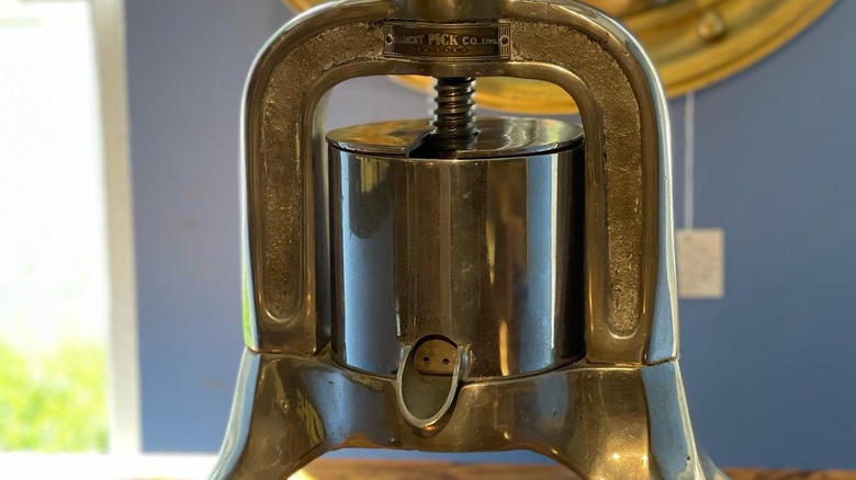 Anyone who has ever been to an old and established winery — or had an uncle who grew grapes in the backyard and fermented his own hooch in the basement — will know what a vintage winepress looks like. Essentially, it's one big corkscrew with a wide, flat base that presses into the grapes when turned. The extracted juices flow into a waiting barrel from a spout at the bottom of the press (via the National Museum of American History). The same principle applies to the duck press.