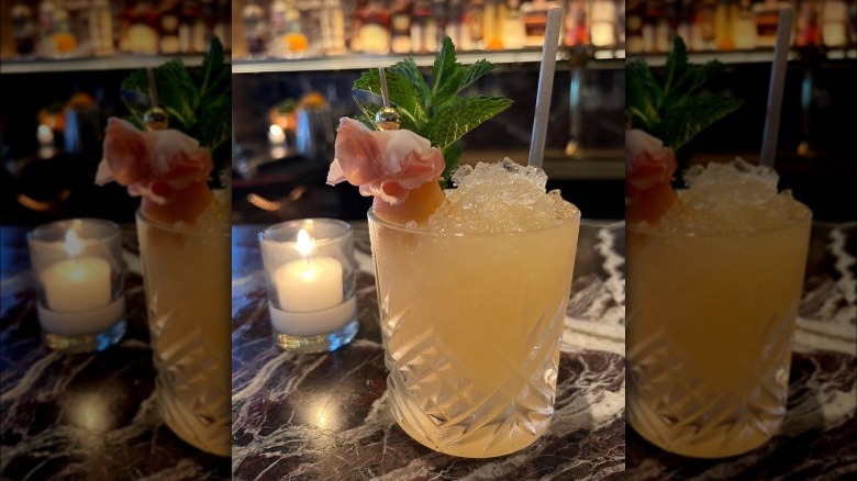 Per Don Angie to Tasting Table, the cocktail's recipe calls for one-ounce shots of the prosciutto-washed Banks Rum and fresh cantaloupe purée, as well as half-ounce pours of cantaloupe syrup and lemon juice. These ingredients are shaken and strained into a rocks glass filled with crushed ice. Garnishes include mint, melon ball, and prosciutto.