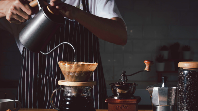 There are plenty of ways to make coffee: Stovetop, machine-made espresso, drip coffee pots, and perhaps fancy and labor-intensive pourover coffee. Pourover coffee entails boiling hot water in a separate kettle and then pouring it slowly over a filter of ground coffee and letting it slowly filter through to brew coffee (via Espro).