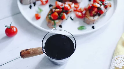 With the glaze both cooled and thickened, you're ready to serve it up. Ryu likes to drizzle the glaze on top of bruschetta, as the tangy flavor perfectly complements the fresh, savory flavors in the popular appetizer. Feel free to get creative with how you serve this honey balsamic glaze, but keep in mind that you don't have to rush to use it all at once. "One of my favorite things about this recipe is that it keeps in the fridge for 3 to 4 weeks," Ryu says. "It's not only simple to make, but because a little goes a long way, if you make a batch of it, it will last a long time."