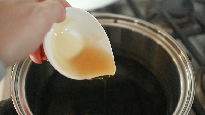Aside from the 2 ingredients, you'll also need a small saucepan to make this recipe happen, so go ahead and place that on the stovetop over medium-low heat. Add in both the balsamic and the honey, and mix them together until thoroughly combined. Allow this mixture to come to a low boil, then quickly turn the heat down — this step is crucial. "[The glaze] can easily burn, and once it gets to that point, there isn't anything you can do to save it," Ryu explains. "To avoid this, make sure to turn the heat to low once it starts to boil. Stir occasionally with a whisk, and check the consistency often."