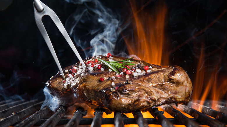 Next, The Spruce Eats recommends salting the steak generously on the exposed side during cooking and flipping it with tongs instead of a fork to keep your meat tender and full of moisture. Be sure to remove it from the heat when it is five degrees below the internal temperature you're aiming for, and let it rest for 10 minutes before slicing.