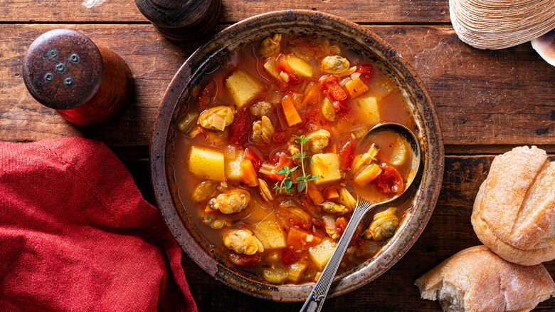 There are two popular and distinct versions of clam chowder: New England and Manhattan. The opposing and defining characteristic is whether the base is made with cream or tomatoes. Some contend it's not chowder if it doesn't have that luscious and heavy creamed stock that corn, mushroom, and chicken chowder also share in common. Merriam-Webster defines it as "a soup or stew of seafood (as clams or fish) usually made with milk or tomatoes, salt pork, onions, and other vegetables." (via Eater). And while Taste of Home claims chowder almost always features a creamy base for the chunky vegetables and protein, they acquiesce only in the case of the Manhattan kind. For those who can't choose, there are recipes for New Manhattan and Long Island Chowder, which combine cream and tomatoes. Either way, we suggest adding oyster crackers or pan-fried croutons.