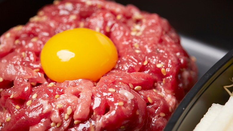 Beef tartare or steak tartare is a raw meal that may seem a bit unsafe to eat, but if made well, it is extremely delicious and enjoyable. According to Oola, any kind of meat can be served "á la tartare," or raw. These types of dishes can be found in many cultures around the world; for example, dulet is a similar minced meat and an Ethiopian delicacy. Much of the world is no stranger to eating raw meats like sushi, and beef tartare is not much different! Made by grinding raw beef with onions, pepper, Worcestershire sauce, capers, and spices together with raw egg yolk to create a velvety and meaty rich dish, beef tartare is usually served with bread in the West today and is typically considered an appetizer.
