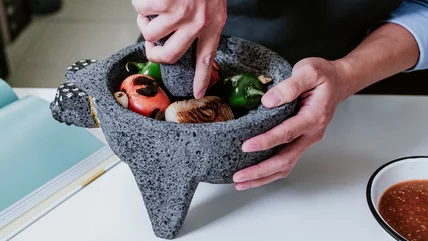 Mexican cuisine is as rich as the various regions that make up the country of 130 million people. Culinary traditions date back several thousand years, before the time of Spanish explorers when the Aztec and Maya people thrived in the region, says Mex Grocer. Instead of a mortar and pestle to grind chiles and corn, these cultures used the molcajete y tejolete. These implements look very similar to a mortar and pestle: They use a rounded stone, able to be held in human hands, to grind food against a stone slab or rounded bowl made of the same hard material as the handheld implement. The first formal mortar and pestle tools, carved from rocks instead of using rocks themselves, were used in Egypt to grind spices around 10,000 years ago, notes Cambridge Environmental Products.