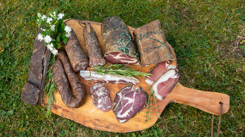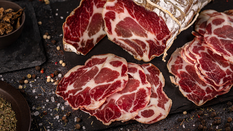 What is coppa? And what makes it so special? Ngo Your Meal says that the word "coppa" is derived from the Italian word "Capo" or the word "Collo," which translate to head and neck, respectively. The coppa meat is a pork collar and is both well-marbled and can be made into salumi (which is perfect for a charcuterie board) or grilled, braised, or smoked (via Bon Appétit). The coppa pairs nicely with spices and herbs such as bay leaves, nutmeg, cinnamon, and cloves, explains Ngo Your Meal.