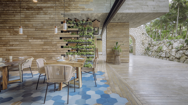 The restaurant's design succeeds at bringing together simple, natural elements. Azure floor tiles break like waves on beach-toned wood, while flashes of green life collide with gray concrete. Everything is open to natural light and fresh air, rejoining the interior restaurant with the tropical biome.