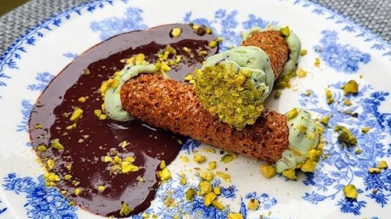Evoking an Italian artist's studio with eccentric decor and distinctively decorated façade, Trattoria Dell'Arte has served Tuscan food to the people of Manhattan for over 35 years (perNew York Post). The restaurant offers a comprehensive menu of irresistible Italian delicacies like fried zucchini flowers and spaghetti carbonara. It was the cannoli that caught our attention. However, the restaurant shirks the typical bubbly pastry shell in favor of a delicate, lacy, and crispy affair that encases a smooth and creamy ricotta that receives rave reviews. There are two varieties of cannoli on offer: One is filled with chocolate and served with blueberry sauce, and the other is sprinkled with pistachios. When we discovered the Trattoria Dell'Arte cannoli are gluten-free and made with almond flour, it cemented its position on our list.