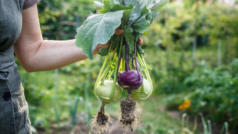 A cool-weather crop, kohlrabi offers hardiness in cultivation for zones 2 to 11, with a growing season that extends into the winter months in some regions. Per the Missouri Botanical Garden, homegrown seedlings or nursery transplants should be spaced 4 to 6 inches apart with 18 inches between rows. It's imperative to maintain enough room between the plants for the bulbs to develop into the desired size. They prefer moist soil and full sun; a top layer of mulch can be added to help retain moisture and prevent weed growth.