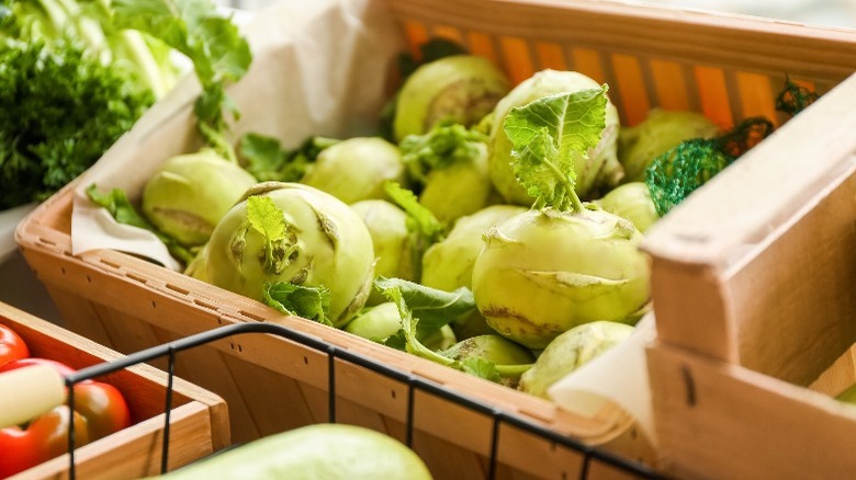 Kohlrabi is frequently available year-round at supermarkets per HowStuffWorks and can be seen in farmers markets and CSA (Community Supported Agriculture) subscription boxes when in season. "I always recommend buying organic from a farmers' market for the freshest and most tasty specimens," recommends Brad Leone (via Bon Appétit). Additionally, he suggests choosing kohlrabi, which still has its leaves. "It's a good indicator that the veg is fresh, and that it was harvested recently, because the leaves wilt faster than the bulb." However, slice the leaves off immediately without penetrating the outer skin; the unpeeled bulbs can be kept loose in the refrigerator for several weeks. The leaves should be placed inside an air-tight plastic bag in the fridge. And it bears repeating — select smaller bulbs when given the option, especially if you're aiming to serve them raw.
