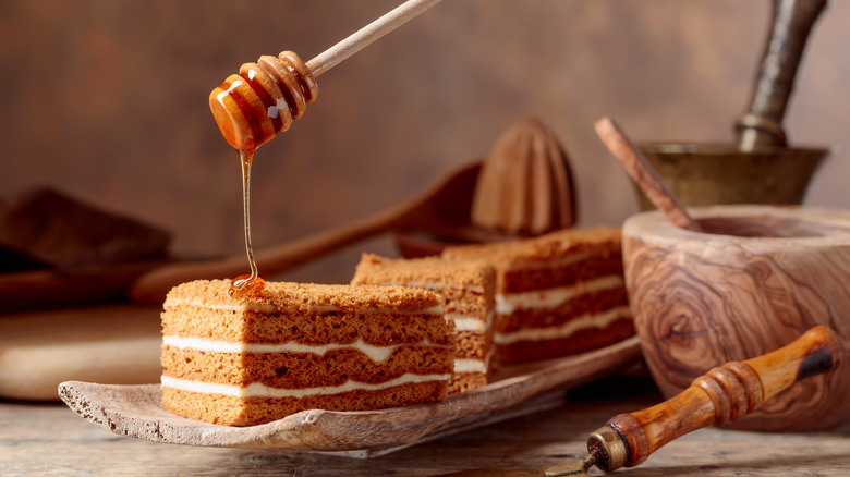 Keep it sweet with maple syrup! Maple syrup is an alternative sweetener to granulated sugar but is also a flavorful addition to ginger cake, maple cake, and some kinds of fruit cake. You should use ¾ cup of maple syrup per each cup of white, granulated sugar (via the Vermont Sugar Makers Association). You should also plan to add a scant amount of baking soda when you make this substitution to help give the cake a bit more rise. Another precaution you'll need to take is the heat of your oven while your cake is baking; maple syrup has a quicker caramelization time than a cake made with white sugar alone.