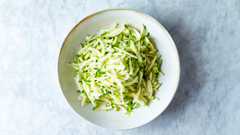 Adding grated vegetables to your cake does more than give you the impression that it's "healthy." Grated carrots, zucchini, beets, or yellow squash can help add additional moisture as well as provide some contrasting textures. If you're adding squash or zucchini to the cake batter, you'll want to grate the peeled vegetable down finely and squeeze out all the moisture with a kitchen towel before adding it to the batter. When these watery vegetable cook, they release a lot of moisture that can alter the structure of your cake — for worse.
