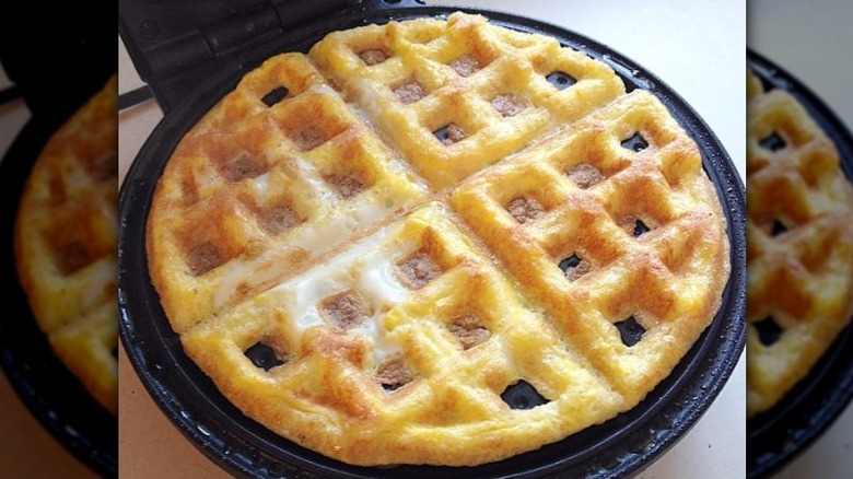 Scramble up a couple of eggs, add anything that tickles your fancy, and then pour it into a steaming hot waffle press. A lot less work than making a true omelet, and you don't have to worry about managing all that delicate flipping first thing in the morning, either. The beauty of a waffle iron is that it cooks both sides perfectly. You'll end up with something even better than an omelet because it also has golden brown, crispy edges — especially when you load it with cheese.