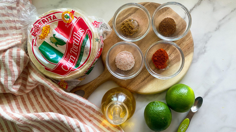 To make this recipe, we'll need some small, 5-inch white corn tortillas, avocado oil, lime, chili powder, cumin, smoked paprika, and salt. Hahn likes to use avocado oil here because it is a good neutral oil and a healthier choice than canola oil which is typically used in store-bought chips. If you don't happen to have a fresh lime, bottled lime juice will do, and you'll need about 2 tablespoons to get that citrusy flavor.