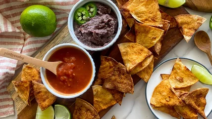 Wellness coach and recipe developer Miriam Hahn brings us this recipe for homemade chili lime tortilla chips and says, "The lime and chili flavor on these chips is so delicious and they taste so much fresher than storebought chips." She notes that there's also a nutritional benefit to making homemade chips. "I also prefer to make them at home because they are so much healthier," she explains. "Baking the chips still results in a crispy, crunchy chip without deep frying them. You can control the oil and not sacrifice any of the taste." These chips go well with guacamole, spinach dip, queso dip or just good ol' salsa. Read on to see how easy they are to make!