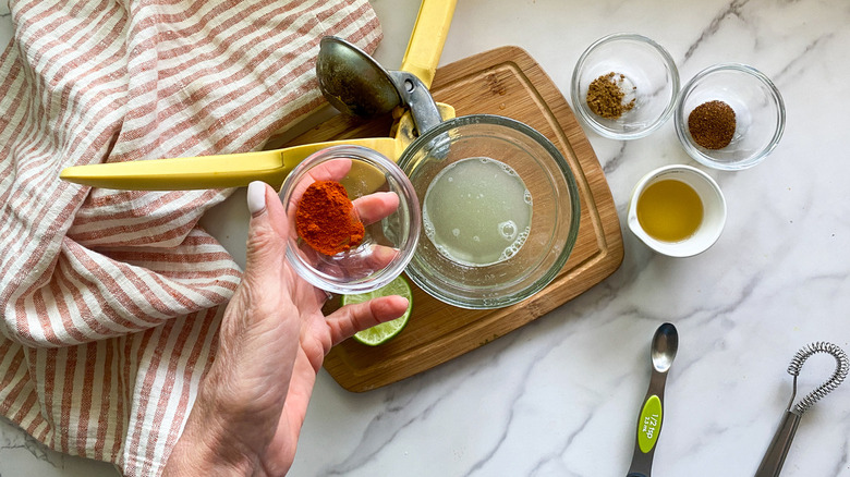 - In a small bowl combine the avocado oil, lime juice, chili powder, cumin, and smoked paprika.