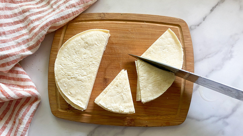 - Stack the tortillas and cut in them half. Then cut each half into 3 triangles, leaving you with 30 chips total.