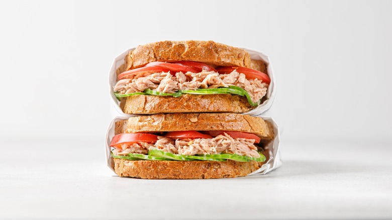 Now, tuna may be a popular lunchtime option, but there are plenty of ways to turn this classic sandwich on its head. For a deliciously green twist, tap into the green goddess salad craze for a delicious dressing swap on your classic tuna salad sandwich. Typically, you can enjoy this salad as a pre-made, purchasable dressing or even make it from scratch with Greek yogurt, lemon, capers, herbs, and spices. For something totally different, you can add soy sauce to your tuna salad to get a little extra umami flavor. What makes this option even better is that this is one of the secrets to Jimmy John's delicious tuna salad.