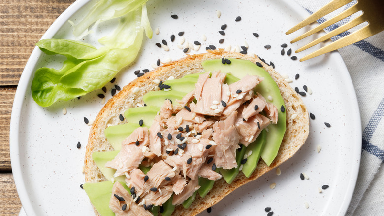 With all of that in mind, this little swap begins looking more and more beneficial. While it will make your tuna salad a little green, it does provide a fair amount of creaminess to create a texture you're sure to love. Since avocados don't have the same tartness as mayonnaise, you'll want to add salt and a little vinegar or lemon to achieve a similar effect. To increase that creaminess, consider adding a dollop of that Greek yogurt. It'll no doubt add some intrigue to your tuna salad. You can also enjoy avocado as a substitute for mayo by slicing the avocado, placing it on bread, and putting tuna on top.