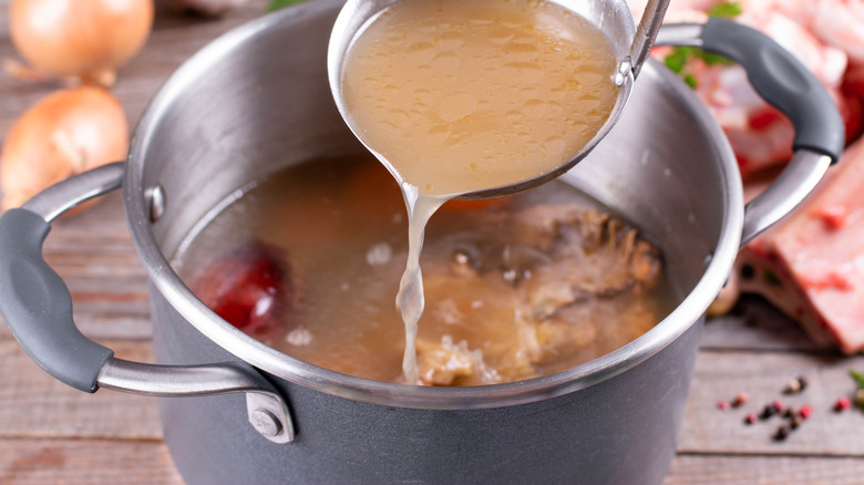The science of flavor distraction harkens to 1855 when Adolph Fick explored the movement of molecules from higher concentrations to lower ones, per La Petit Noisette. Fick's law stated "that the rate of diffusion of a substance across unit area (such as a surface or membrane) is proportional to the concentration gradient," according to Science Direct. As the law applies to a quality stock, factors such as surface area, pressure, flavor concentration, and temperature play important roles, La Petit Noisette explains. And, when it comes to temperature, the higher the temperature, the faster flavor molecules will move. So, considering water boils at 100 degrees Celcius, or 212 degrees Fahrenheit, the bone fat quickly emulsifies into the agitated stock creating cloudy conditions.