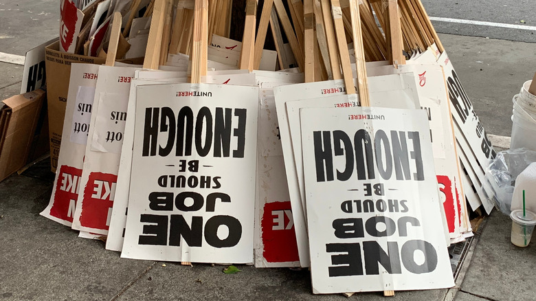 "Power to the People" has emerged as a perhaps unlikely (yet tremendously exciting) theme of 2022. Starbucks Workers United has successfully unionized 270 stores this year (via Twitter). The staff of The New York Times recently staged a mass walk-out after seeing fair pay contract negotiations stalled. Rail workers and Amazon employees have been speaking out against unfair working conditions (via NBC and The Guardian). Now, it's California fast food workers' turn to have a seat at the table. At least, it was ...