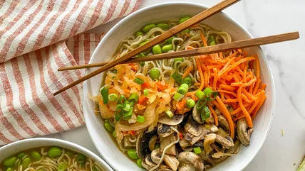 Now, you are ready to assemble the ramen bowls. Ladle out some of the brothy, noodle mixture into 2 wide bowls. Add in some of the sautéed mushrooms, shredded carrots, kimchi, and chopped scallions. "This ramen bowl makes a great lunch or dinner in under 15 minutes, and is full of protein, fiber, vitamins, minerals, and gut boosting bacteria," Hahn remarks. It's great on its own, but pairs well with cucumber salad, pot stickers, shrimp, chicken, or tofu. If you have leftovers, Hahn says everything will last up to a week, but suggests keeping the ingredients separate, and assembling before eating.