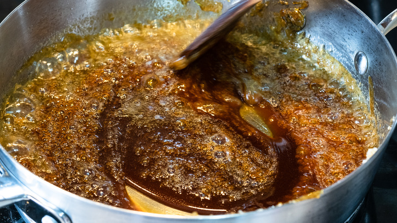To deglaze, you can use many different kinds of liquid ranging from wine and liquor to juice and stock, according to PBS. Julia Child recommended this technique to "capture the richest flavors" in a sauce. Once the browned bits have released from the pan and are in the sauce, add your prepared mother sauce into the pan and allow it time to simmer. Once the contents have simmered into a delicious, balanced mixture, The Culinary Pro advises finishing with monter au beurre. That simply means adding a form of dairy to the sauce, such as butter, cream, or yogurt, among other options, to balance acidity and add more richness.
