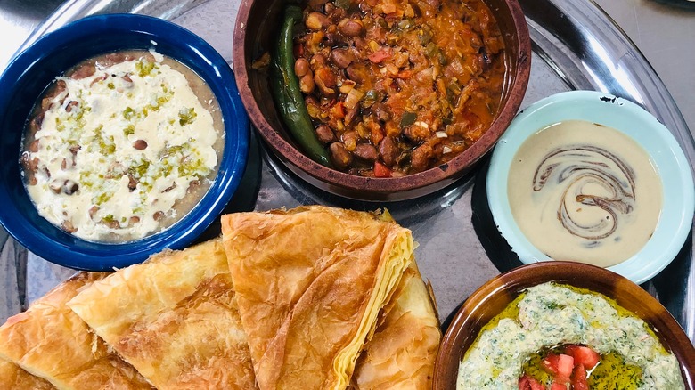 While the dough is simple, fiteer can be spruced up with a near-endless variety of add-ons. The basic ingredients for the dough are ghee, flour, water, and salt, though some recipes include sugar or baking powder. However, Taste Atlas explains that while some versions of fiteer are served plain, the delicacy is typically eaten with side dishes or fillings. A wide variety of ingredients like meats or sausages, cheese, halwa, nuts, vegetables, and raisins are served as toppings or folded into the dough to add texture and flavor. Popular Middle Eastern sauces, like tahini, honey, or molasses, can be drizzled on top.