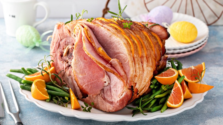 You might not get the perfectly clean slices you want, but bone-in ham has clear benefits over its deboned counterpart. According to MyRecipes, bone-in hams will be more juicy than boneless, resulting in more tender, well-cooked meat. This comes from a few different factors. As Serious Eats notes, bones help moderate the temperature in meat, which slows down cooking and allows the fat to render. Bones also have fat and tissue attached to them that gets lost when removed from your ham. That fat adds moisture and flavor to your meal, giving your bone-in ham an extra savoriness that's lost with the convenience of boneless.