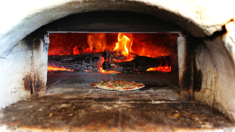 Traditional Neapolitan-style pizzas are made in a wood-fired oven. These ovens can reach temperatures in the thousands, and pizzas baked in them require a very short cooking time. This quick-but-hot cooking prevents the pizza dough from becoming too dry, which can easily happen when pizza is baked at lower temperatures (and is probably the reason your home pizza crust is too hard).