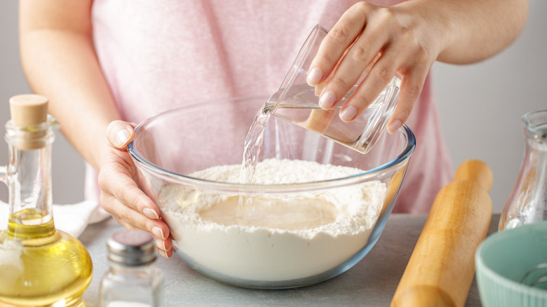 Even though adding water to dough can seem like a recipe for a soggy crust, using the proper amount of liquid is an essential part of making pizza dough with a perfectly crisp crust. The ratio of water to flour (often called "hydration") has to be in perfect harmony to achieve the right crust texture. Water turns into steam during the baking process, which contributes to leavening and helps the gluten strands soften so large air bubbles can form.