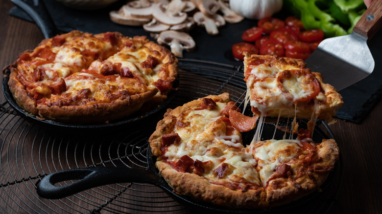Stickage can be an issue, but there are a few ways to prevent pizza from sticking to a cast iron skillet. Using a blend of flour and cornmeal on the pan before adding the dough can help the pizza release from the pan when done cooking. According to Martin Philip, head baker at King Arthur Baking Co., "cornmeal keeps the dough from sticking and, once toasted, adds a nutty speckled crunch to the bottom crust." For a similarly crispy texture without the cornmeal, coating the pan in a generous amount of olive oil could be the answer. Not only will the oil prevent the dough from sticking to the pan, but it also transfers heat and can help create a deliciously crispy crust.