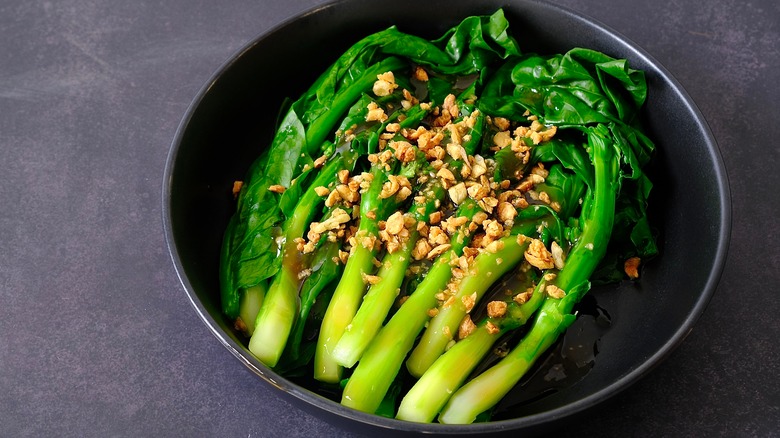 Originating in China, gai lan is a fresh leafy green that's part of the Brassica family, just like broccoli and kale. Like other members of the same family, gai lan is incredibly nutrient-dense; it provides just over 40% of your daily recommended vitamin C, according to WebMD. In addition to offering health benefits, gai lan is the perfect simple, crisp, and fresh side dish when stir-fried with garlic, chili, and oyster sauce. Furthermore, gai lan represents harmony in family and relationships.