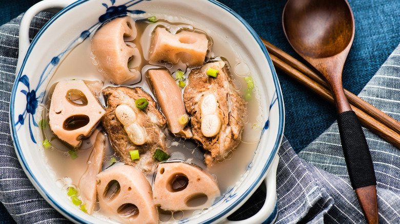 One of the most common ways to enjoy lotus for the Chinese New Year is in a hearty soup with a subtle sweetness. Lotus root soup with pork ribs is perfect for omnivores; the ribs impart a fatty, salty depth of flavor. Alternatively, vegetarian preparations with peanuts are just as popular — they symbolize longevity, via The Journal of Ethnic Foods. Although it's hard to date when lotus root soup began to be associated with Chinese New Year, archaeologists uncovered a pot of lotus soup in an ancient tomb, per ECNS.