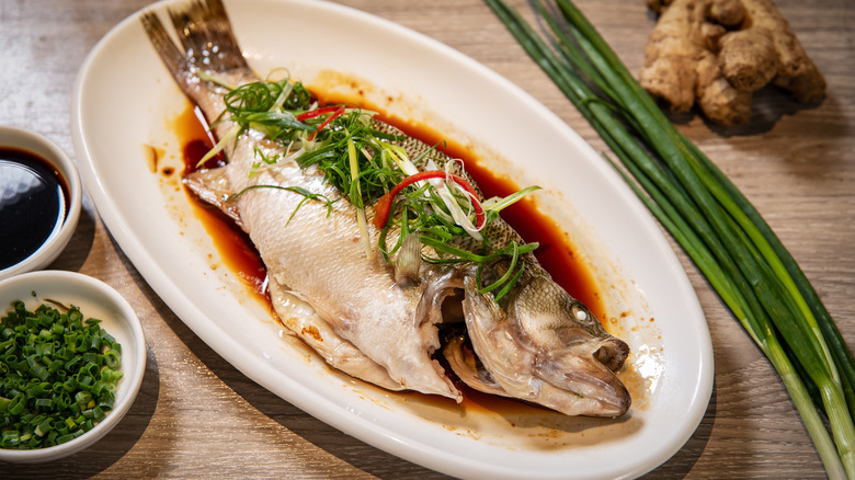 Steamed fish is a simple meal that retains the complex, natural flavors of the fish while adding aromatic notes from peppercorns, ginger, and scallions, along with a soy sauce dressing. It's usually the centerpiece of a Chinese New Year feast, particularly in coastal regions across China. Serving the fish whole is mandatory; the uncut head and tail symbolize completion from beginning to end. Even the Mandarin Chinese word for fish, yú, has the same pronunciation as "abundance" or "surplus," indicating that you may obtain an abundance of wealth very soon, (via One World Nations Online).