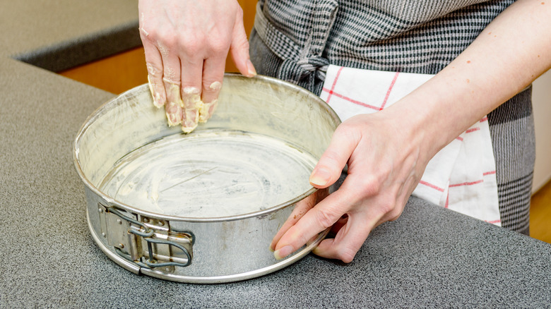 Eat Well 101 suggests the next step, which requires a bit of patience but is definitely worth the wait: Put your greased pan in the freezer or refrigerator for a short time so that the butter solidifies again. This process hardens the protective butter layer on your pan, thus further separating the cake batter from the pan. Without this step, it will be harder to ensure that your cake comes out cleanly and smoothly. Compared to room temperature or warm butter, cold butter is more likely to remain in a solid state while baking, which can create an effective barrier and help to prevent the cake from sticking, per King Arthur Baking. Additionally, cold butter is less likely to leave behind excess grease in the pan. So the next time you're preparing a cake, be sure to cool your buttered pan for the best results.