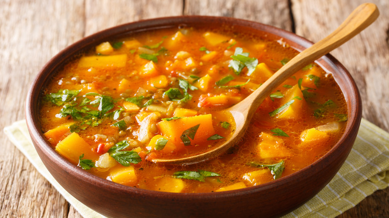 To ensure the soup's ingredients reach their full potential, extra attention should be given to the vegetables. For example, some vegetables should be sweated, such as onion, garlic, and celery to enhance their flavor, per Chatelaine. By sautéing the vegetables in oil or butter first, they become softer, and their flavor is enhanced. As big of a time-saver as it can be to add all of the vegetables to the soup pot at one time, America's Test Kitchen states that adding vegetables to the broth should be staggered. This is a necessary step when multiple kinds of vegetables are used in a soup because of different cook times.