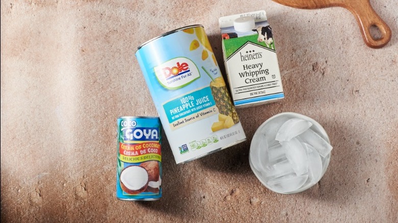 - Add ice to a blender. Pour the cream of coconut, pineapple juice, and heavy whipping cream over the ice. Blend everything until completely smooth. Optionally add frozen pineapple, or more ice to make the drink thicker.