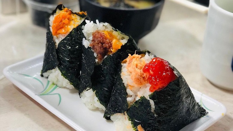 Despite its simplicity, this rice snack can be an art form in itself, with onigiri masters bringing their own unique vision into the mix. In essence, an onigiri is salted sushi rice shaped into triangles or cylinders, stuffed with filling, and wrapped in nori (dried seaweed). Traditional fillings are salmon, tuna, cod roe, dried kelp, pickled radish, pickled plum, and tofu, but the options and combos are endless (via Chef Ja Cooks).