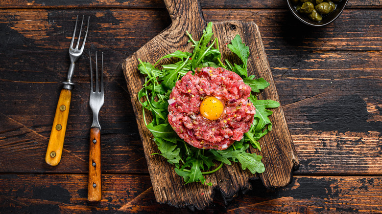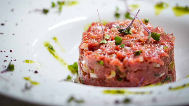 With such an exotic-sounding name like "steak tartare," you'd probably expect the dish to carry a lofty price tag to match. In December 2022, AgriLife Today reported that the price of beef is higher than it's been in decades due to inflation. Plus, considering steak tartare resides on the menus of some of the fanciest restaurants in the world, it must be a costly dish for restaurants to make ... right? Think again. Believe it or not, there's a sustainable reason why chefs love steak tartare.