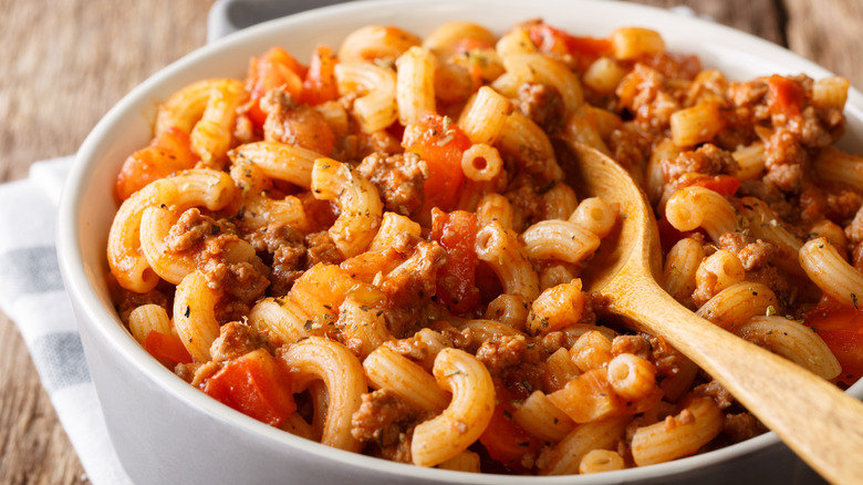 Resembling very little like chop suey one might find in a Chinese American restaurant, American chop suey looks more suitable for a diner in a Midwest grandma's kitchen. Made from elbow macaroni, canned tomatoes, green bell pepper, mozzarella cheese, and ground beef, the recipe is certainly more classic American than mainland China. It's also seasoned with oregano, parsley, and red pepper flakes, which appear frequently in comfort dishes stateside. American chop suey also goes by the names of beefaroni, chili mac, and Johnny Marzetti.