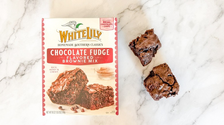 White Lily is a brand I more often associate with cornbread and biscuits than chocolate fudge brownie mix, but I guess I'll take it. The labeling looks rustic, though the brownies on the box look more delicious than some of the other brands depicted on their packaging.