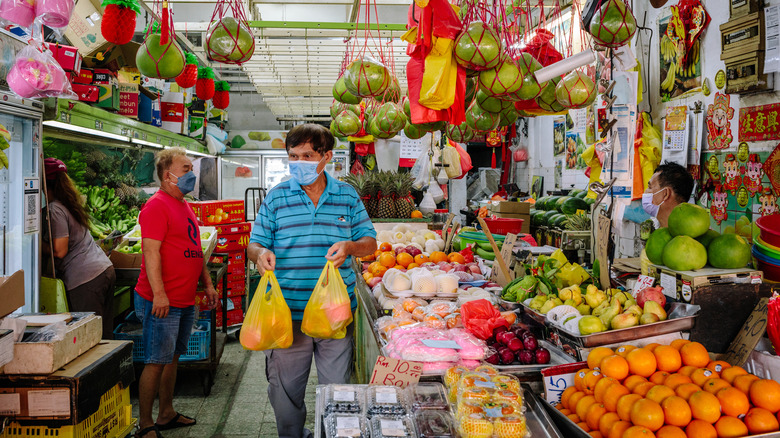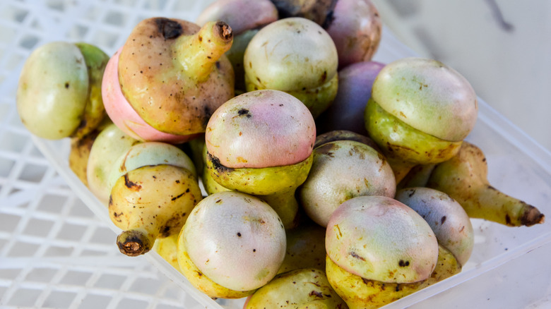 Being native to the area, engkalak is most commonly found in food markets around Borneo. However, according to Specialty Produce, they can also be seen in specialty stores and markets across Malaysia, Taiwan, the Phillippines, Indonesia, and China. Depending on their ripeness, engkalak can range in color from light green to bright reddish pink — the latter being the point at which they're edible. Round and small, engkalak have smooth skin and a cute green cap that is easily removed. Their flesh ranges in color from pale green to white, and they have a rich and creamy texture.